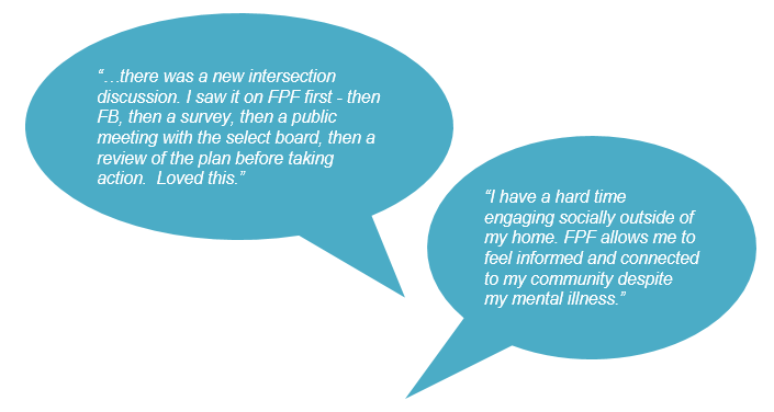 Hyperlocal is not dead: Many smaller communities lack good local news and information sources. The fact that FPF is by, for and about Vermonters was second highest ranked driver of platform engagement. FPF built a service and a company intent on supporting authentic community interactions and opportunities to share information. In a limited analysis of open-ended responses about why they remain a member of FPF, members testified that FPF was the best source of community information they could get. Especially in rural and small communities, there is an information gap that technology is well-positioned to bridge to keep people informed, connected and aware of opportunities.